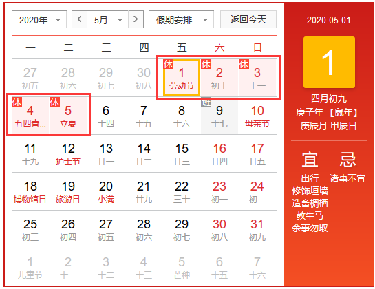 2020年北京華康普美科技有限公司,“五一勞動(dòng)節(jié)”假期為:5月1日-5月5日放假調(diào)休,共5天,5月9日(周六)上班。