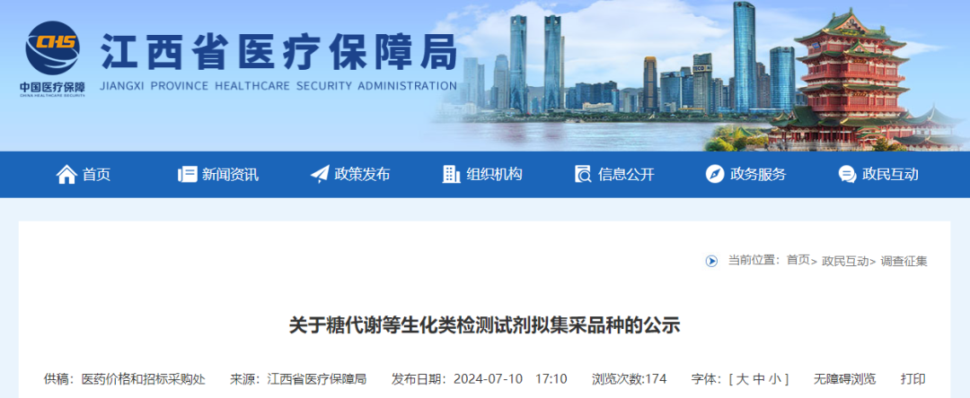 7月10日,江西醫(yī)保局發(fā)布《關于糖代謝等生化類檢測試劑擬集采品種的公示》。