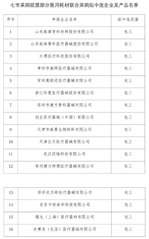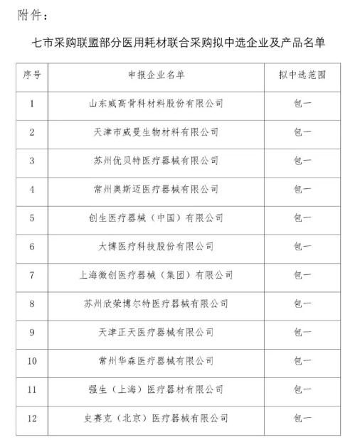 事實上,早在11月初,七市聯盟就已發布公告表示,將對骨科創傷類(普通接骨板及配套螺釘<國產/進口>、鎖定接骨板及配套螺釘<國產/進口>、髓內釘系統及附件<國產/進口>),血液透析類(血液過濾器、血液透析器、一次性使用透析護理包、血液透析濃縮液、一次性透析用血液回路管)兩類醫用耗材,以不低于年采購量70%的約定采購量以量換價。