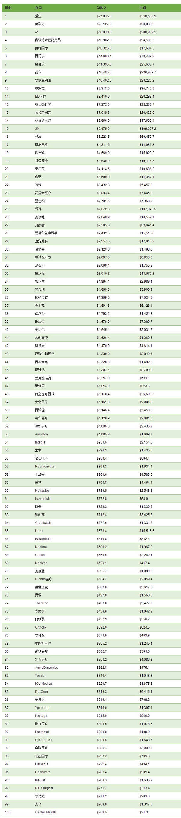 2015年全球醫療器械公司100強