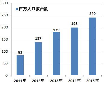 圖1-3 2011-2015年全國每百萬人口平均報告數比較