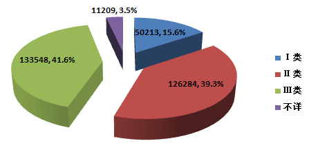 2015年,全國上報的可疑醫療器械不良事件報告中,涉及Ⅲ類醫療器械的報告133,548份,占總報告數的41.6%;涉及Ⅱ類醫療器械的報告126,284份,占總報告數的39.3%;涉及Ⅰ類醫療器械的報告50,213份,占總報告數的15.6%;部分報告涉及的器械管理類別不詳,共 11,209份,占總報告數的3.5%。數據顯示,涉及Ⅲ類和Ⅱ類醫療器械的報告占絕大多數,這與醫療器械風險程度高低相吻合(圖2-3)。