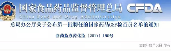 1月4日,國家食藥監總局發布《關于公布第一批聘任的國家藥品GSP檢查員名單的通知》。