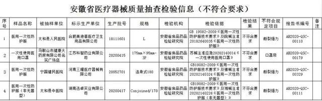 其中,在太和縣人民醫院抽樣的,標示為合肥美迪普醫療衛生用品有限公司生產的醫用一次性防護服,生產批號18111601,規格L;寧國健民醫院抽樣的,標示為河南三耀醫療器械有限公司生產的醫用一次性防護服,生產批號20052701,規格連身式180;太和縣中醫院抽樣的,標示為湖南迅卓實業有限公司生產的醫用一次性防護服(非無菌型),生產批號20200417,規格Conjoined/170;均斷裂強力不符合要求。