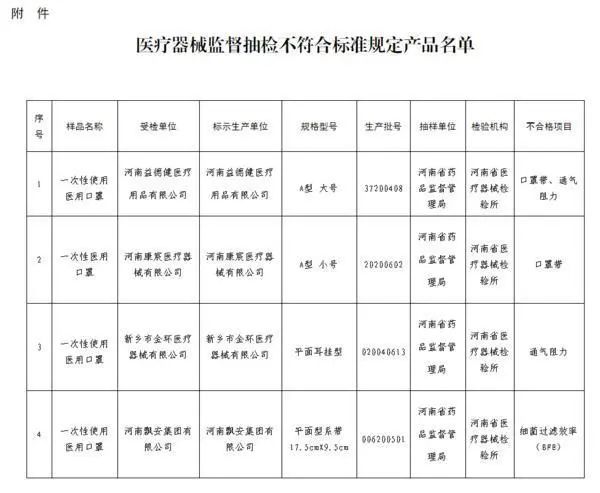 1.河南益德健醫療用品有限公司生產的1批次一次性使用醫用口罩,規格型號:A型大號,生產日期:2020年4月8日,生產批號:37200408,不合格項目:口罩帶、通氣阻力。
