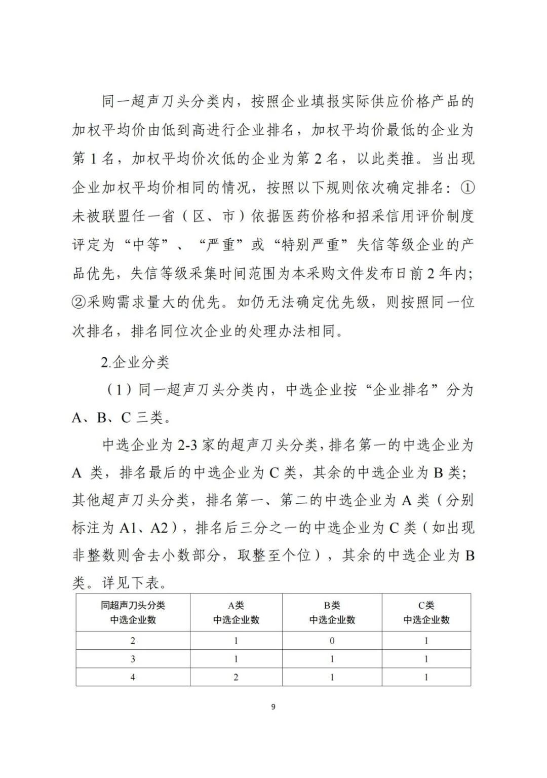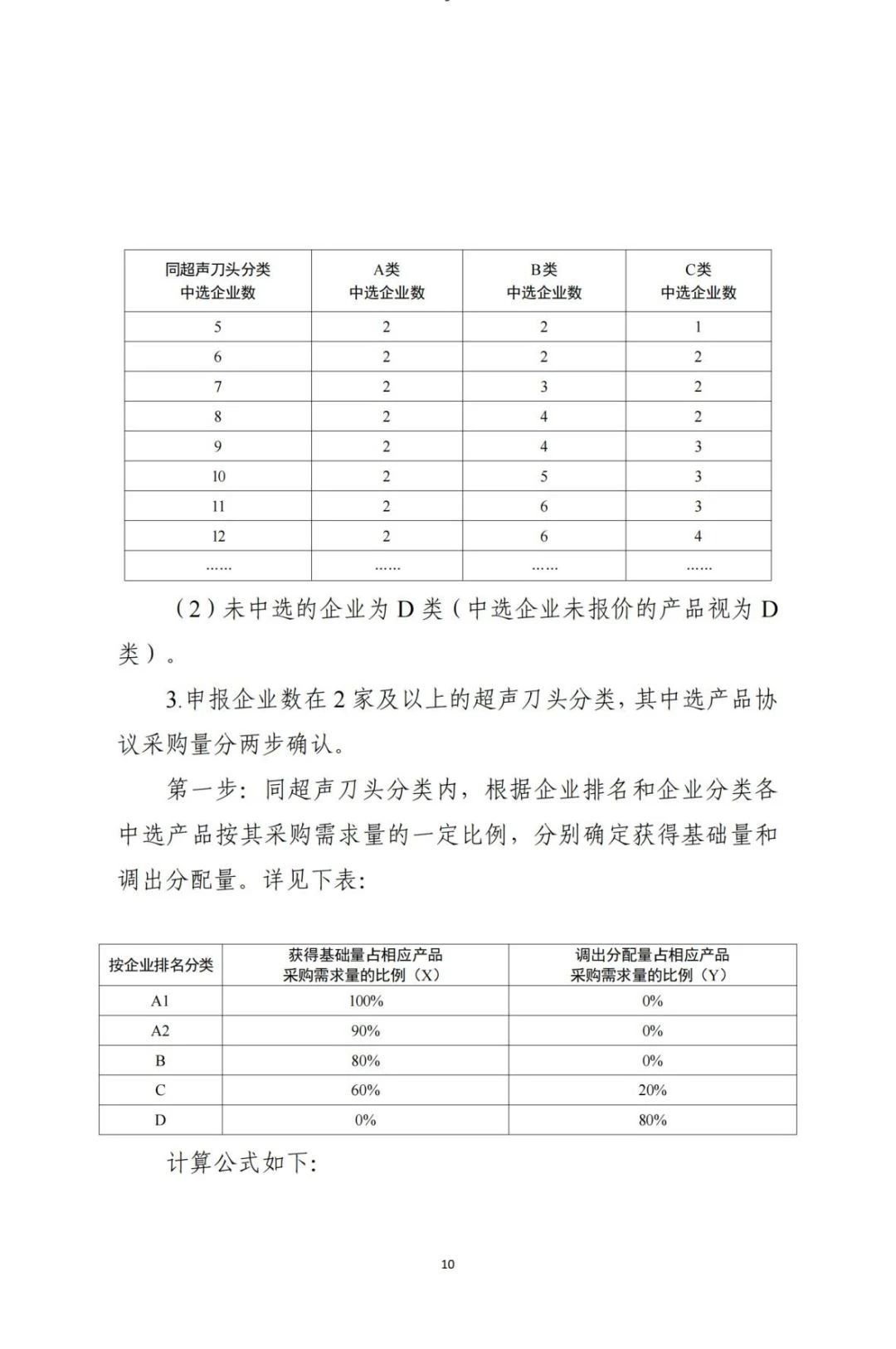 同一超聲刀頭分類內,中選企業按“企業排名”分為A、B、C三類,未中選的企業為D類,中選企業未報價的產品也視為D類,分類情況與協議采購量直接掛鉤(具體分配規則見文末)。