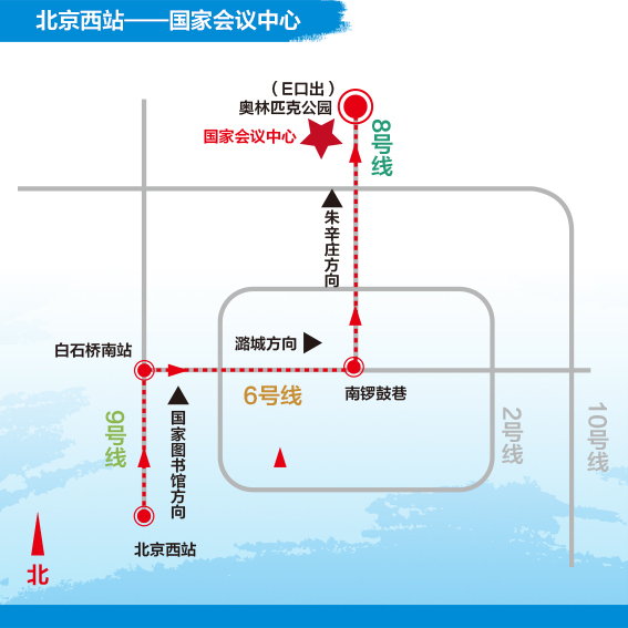乘坐地鐵9號(hào)線(國(guó)家圖書館方向)在白石橋南站下車,換乘地鐵6號(hào)線(潞城方向)在南鑼鼓巷站下車,再換乘地鐵8號(hào)線(朱辛莊方向)在在奧林匹克公園站下車,步行約250米至國(guó)家會(huì)議中心。