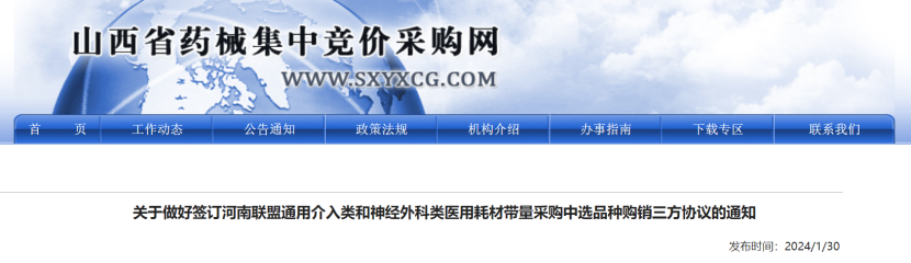 根據(jù)通知, 2024年1月30日起,山西省醫(yī)保平臺(tái)開(kāi)通通用介入類(lèi)和神經(jīng)外科類(lèi)醫(yī)用耗材帶量采購(gòu)三方購(gòu)銷(xiāo)協(xié)議簽訂系統(tǒng)、冠脈導(dǎo)引導(dǎo)絲(接續(xù))帶量采購(gòu)三方購(gòu)銷(xiāo)協(xié)議簽訂系統(tǒng)。