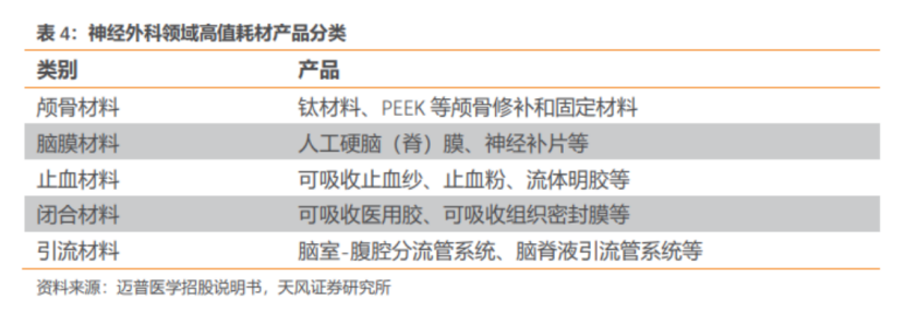 神經(jīng)外科耗材包括顱骨材料、腦膜材料、引流材料、縫合材料、神經(jīng)刺激材料、腦電監(jiān)測(cè)材料、輔助工具等,整體技術(shù)門(mén)檻較高。
