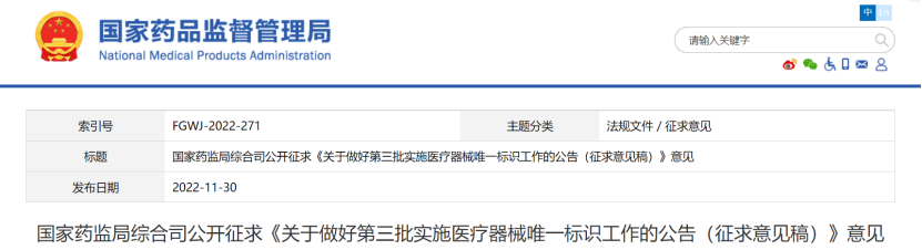 11月30日,國家藥監局綜合司發布《關于做好第三批實施醫療器械唯一標識工作的公告(征求意見稿)》(以下簡稱《征求意見稿》)。