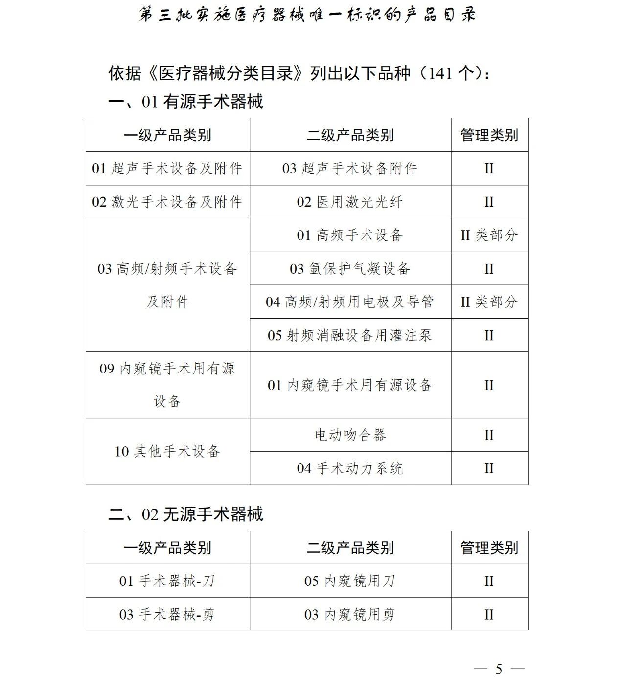 《第三批實施醫療器械唯一標識的產品目錄》中包括141種醫療器械,如超聲手術設備附件、醫用激光光纖、高頻手術設備、電動吻合器、血管縫合裝置、光學內窺鏡、電子內窺鏡、腹膜透析設備、起搏系統分析設備、活檢針、防護服、助聽器、血細胞分析儀器等。