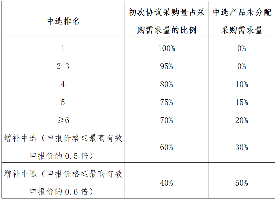本次聯盟集采按同一競價組中選排名確定初次協議采購量,初次協議采購量占采購需求的比例如下: