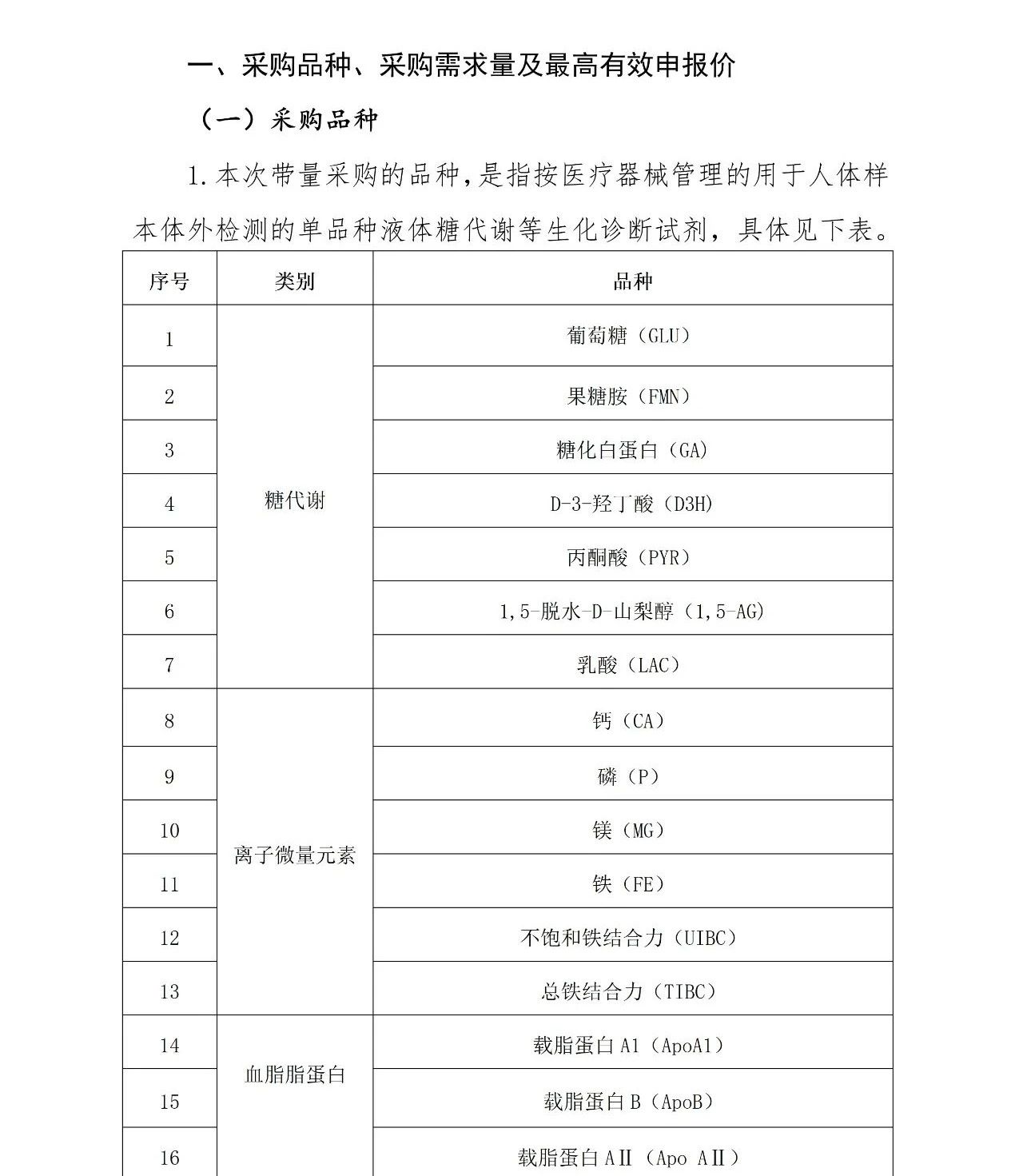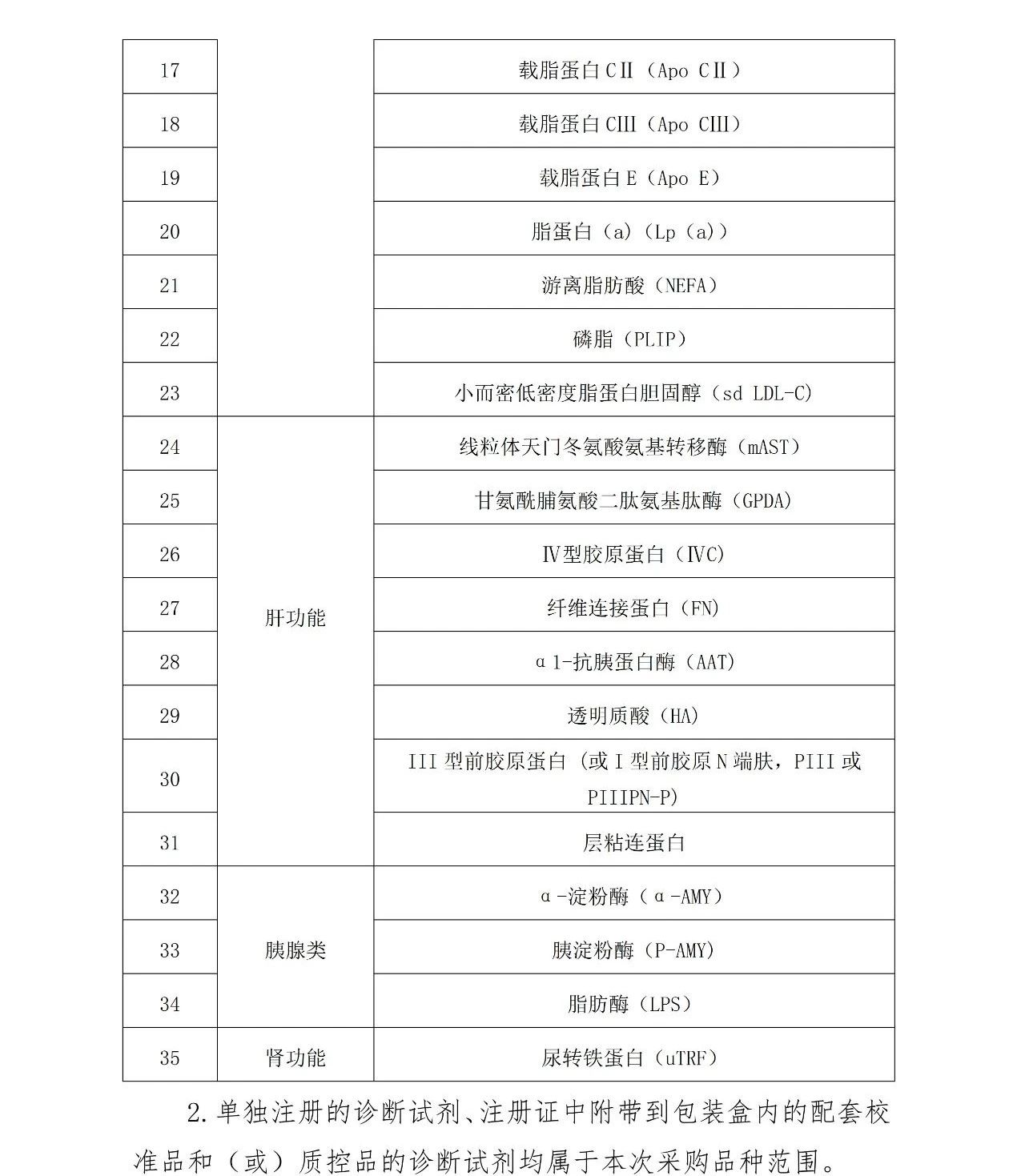 此次采購周期原則上為2年,采購品種糖代謝、離子微量元素、血脂和脂蛋白、肝功類、胰腺類、腎功類6個類別35個品種,具體如下: