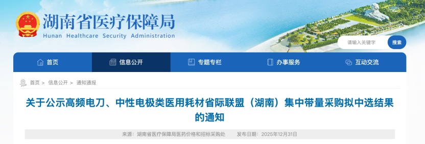 近日,湖南醫保局發布《關于公示高頻電刀、中性電極類醫用耗材省際聯盟(湖南)集中帶量采購擬中選結果的通知》,公示時間截至2026年1月9日17:00。
