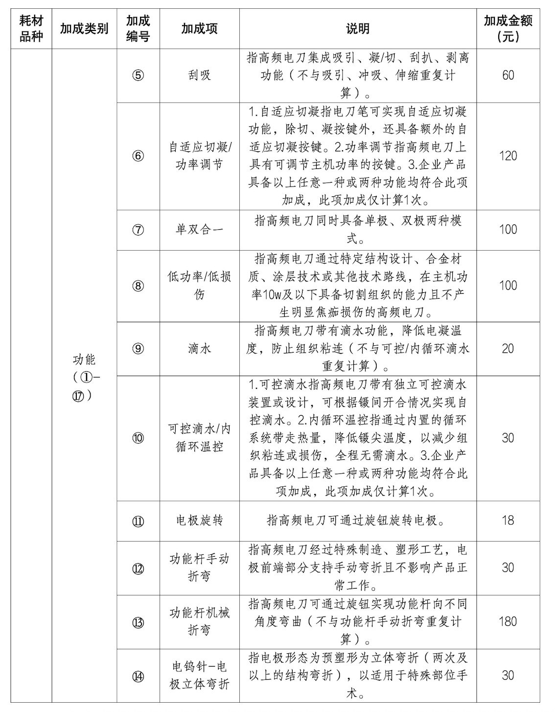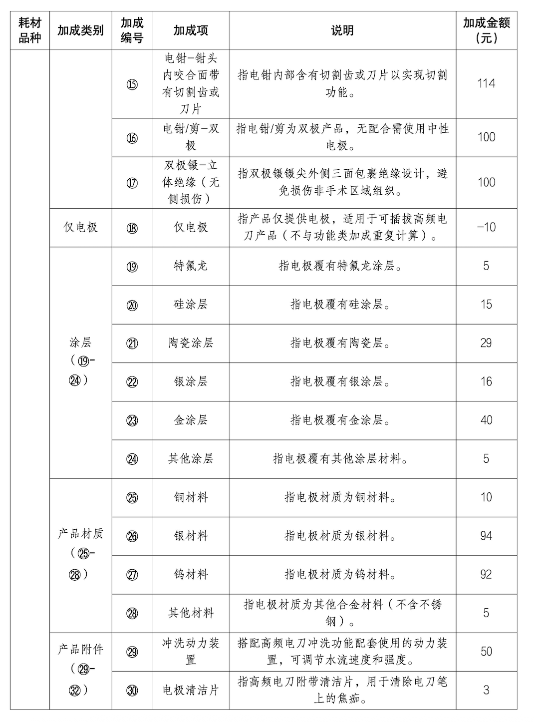 其中采用“商品價值(基礎價)+創新價值(加成)”的雙維度報價模式,按照不同特殊功能、涂層、產品材質、產品附件等共計35項進行加成調節。例如自適應切凝/功率調節加成金額為120元,功能桿機械折彎加成金額為180元,單極雙極合一、低功率/低損傷、電鉗/剪-雙極、雙極鑷-立體絕緣(無側損傷)等功能加成金額為100元。