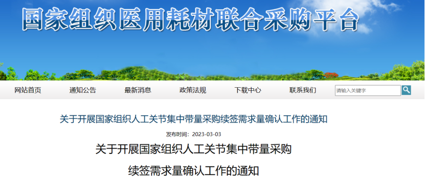今日(3月3日),國家組織高值醫用耗材聯合采購辦公室發布《關于開展國家組織人工關節集中帶量采購續簽需求量確認工作的通知》,為確保國家組織人工關節集中帶量采購首年協議期滿后平穩有序銜接第二年協議期,開展中選產品續簽需求量確認工作。