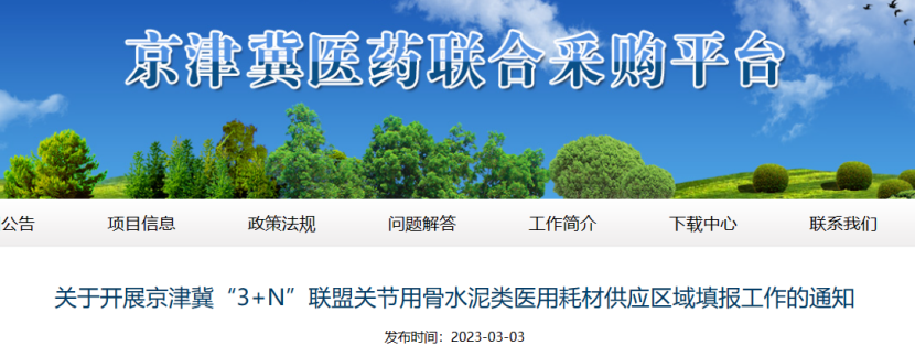 《通知》要求,為做好省際聯盟骨科創傷類醫用耗材集中帶量采購、京津冀“3+N”聯盟關節用骨水泥類醫用耗材集中帶量采購,現開展供應區域填報工作,填報時間為2023年3月3日9:00至3月4日17:00。