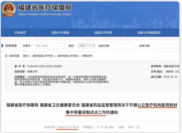 1月13日,福建省醫(yī)保局、省衛(wèi)生健康委員會(huì)、省藥監(jiān)局發(fā)布《關(guān)于開展公立醫(yī)療機(jī)構(gòu)醫(yī)用耗材集中帶量采購試點(diǎn)工作的通知》。
