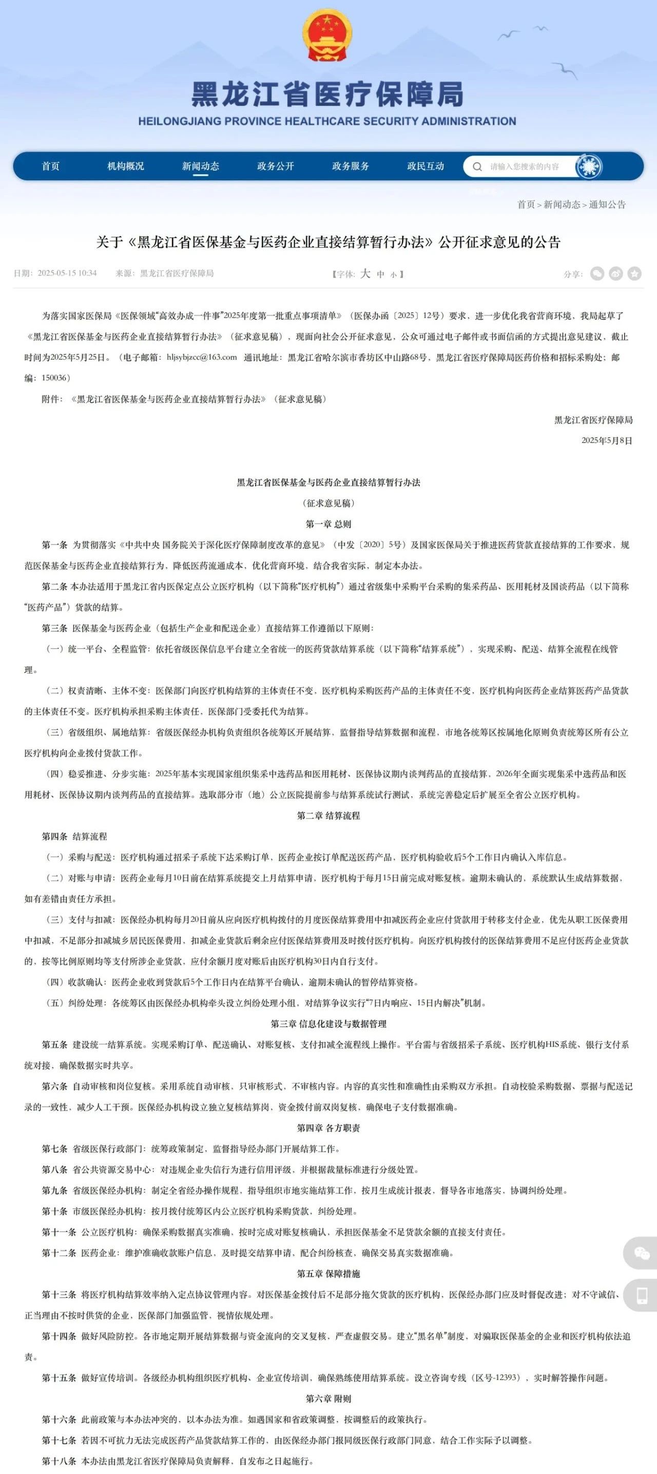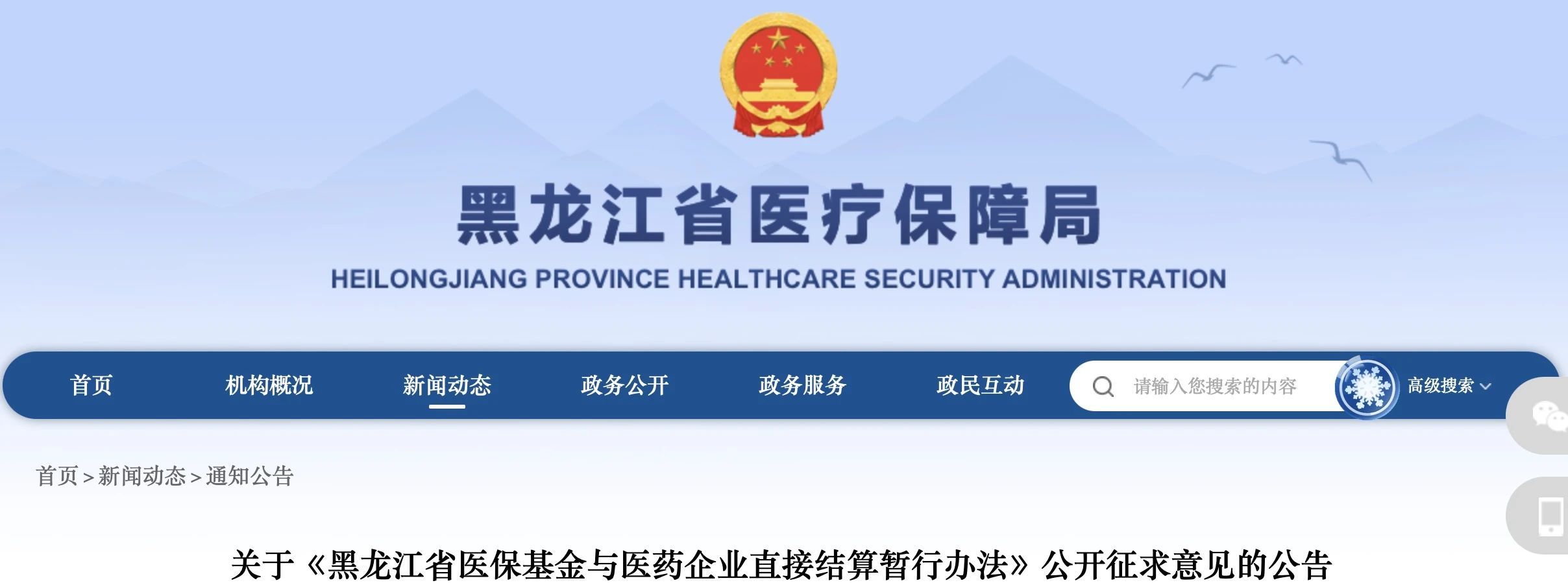今日(5月15日),黑龍江醫(yī)保局官網(wǎng)發(fā)布《黑龍江省醫(yī)保基金與醫(yī)藥企業(yè)直接結(jié)算暫行辦法》(完整見文末)。