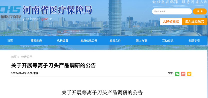 9月25日,河南醫保局發布《關于開展等離子刀頭產品調研的公告》。