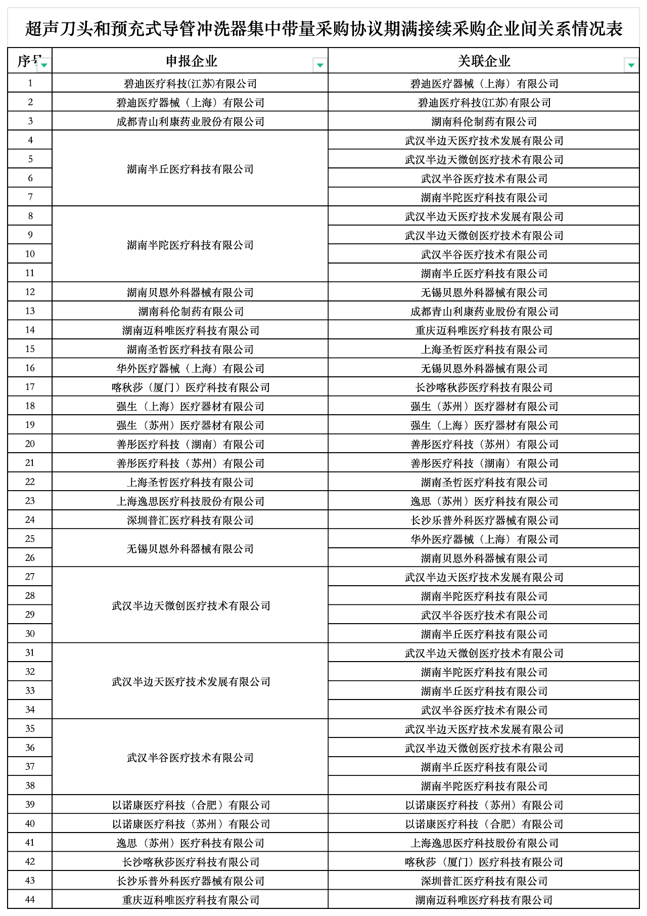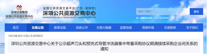 12月12日,深圳公共資源交易中心發布《深圳公共資源交易中心關于公示超聲刀頭和預充式導管沖洗器集中帶量采購協議期滿接續采購企業間關系的通知》(名單見文末),于2024年12月12日-2024年12月17日17:00進行公示。