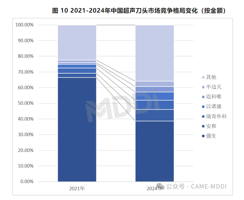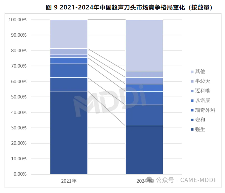 集采給上述兩個細分市場也帶來了顯著影響。尤其在超聲刀領域,集采降價后,該領域市場滲透率快速提升,據醫裝勝數數據,預計到2025年中國超聲刀頭市場滲透率將首次突破10%,到2028年達到24.39%。