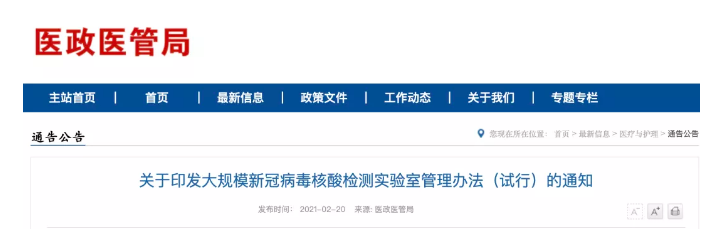 日前,國家衛健委印發“大規模新冠病毒核酸檢測實驗室管理辦法(試行)”通知,指導各地規范開展大規模新冠病毒核酸檢測工作。據賽柏藍器械觀察,《管理辦法》中對于城市和縣域做了明確區分,其中對于承擔縣域大規模新冠病毒核酸檢測的實驗室,原則上還應當具備每天檢測至少1000管的能力。