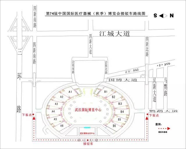 三環(huán)線——江城大道——四新南路——南路主通道——A區(qū)停車區(qū)停放——南路主通道——四新南路離開或經(jīng)西交通樞紐站——國博大道離開——或到B區(qū)停車區(qū)停放。