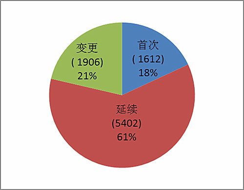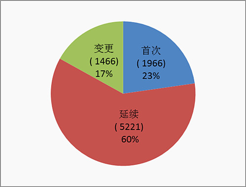 按照注冊式形區分,首次注冊1966項占全部注冊的23%,延續注冊5221項占全部注冊申請的60%,許可事項變更注冊1466項占全部注冊申請的17%。注冊形式比例情況見圖6。