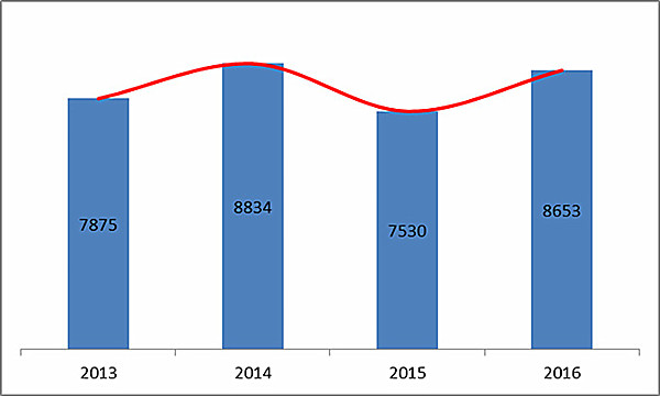 2016年,食品藥品監管總局共批準醫療器械注冊、延續注冊和許可事項變更注冊8653項。與2015年相比注冊批準總數量增長14.9%。