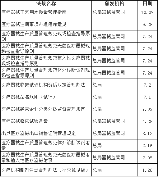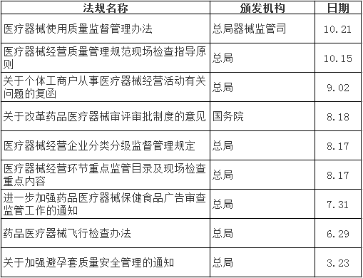 2014年-2015年,在行業(yè)母法國務(wù)院《醫(yī)療器械監(jiān)督管理條件》歷經(jīng)10年修改終于落地的背景下,CFDA在醫(yī)療器械監(jiān)管上先后出臺了多項政策。據(jù)不完全統(tǒng)計,2015年1月以來,由總局及醫(yī)療器械監(jiān)管司出臺的醫(yī)療器械政策征求意見稿至少有14項,由國務(wù)院及總局出臺的醫(yī)療器械法規(guī)、部門規(guī)章和規(guī)范范性文件,多達20余項,比較重要的有9項。
