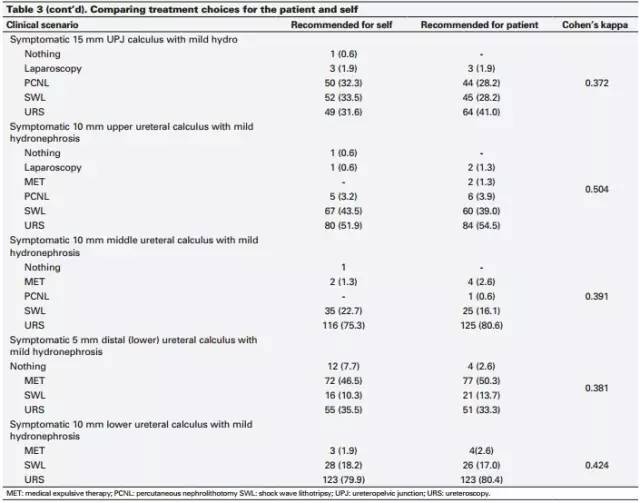 來自38個國家的泌尿外科醫師對兩項調查問卷的回復率分別為78%(160/205)和84%(172/205)。受訪者的平均手術經驗時限為7年(2-30)。共有117(75%)名泌尿外科醫生為教學醫院的醫生。盡管泌尿外科醫生向患者推薦的治療方案與假想自己為患者時所推薦進行的治療方案并不完全吻合。但整體而言,無論是針對自己還是患者,體外碎石與輸尿管鏡(URS)技術都是最受推崇的方案;藥物排石(MET)與腹腔鏡手術是推薦最少的方案。