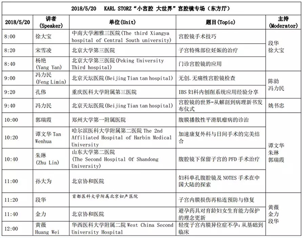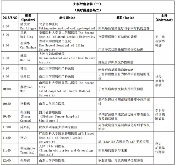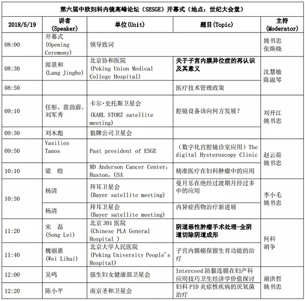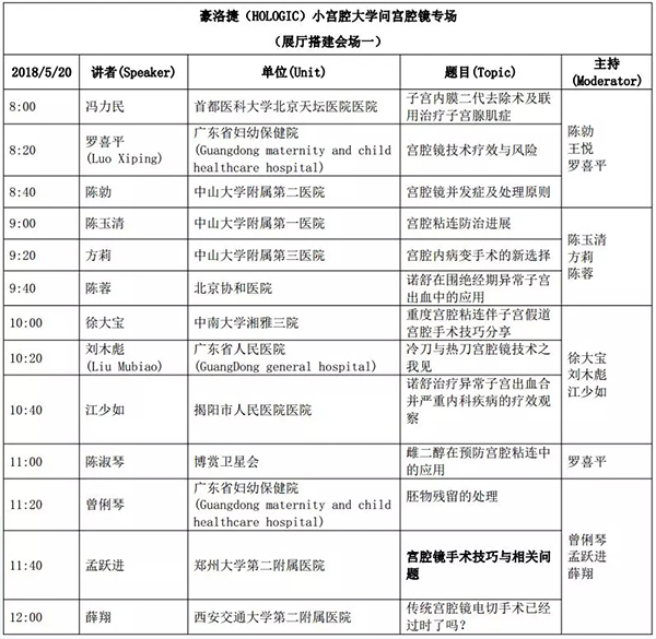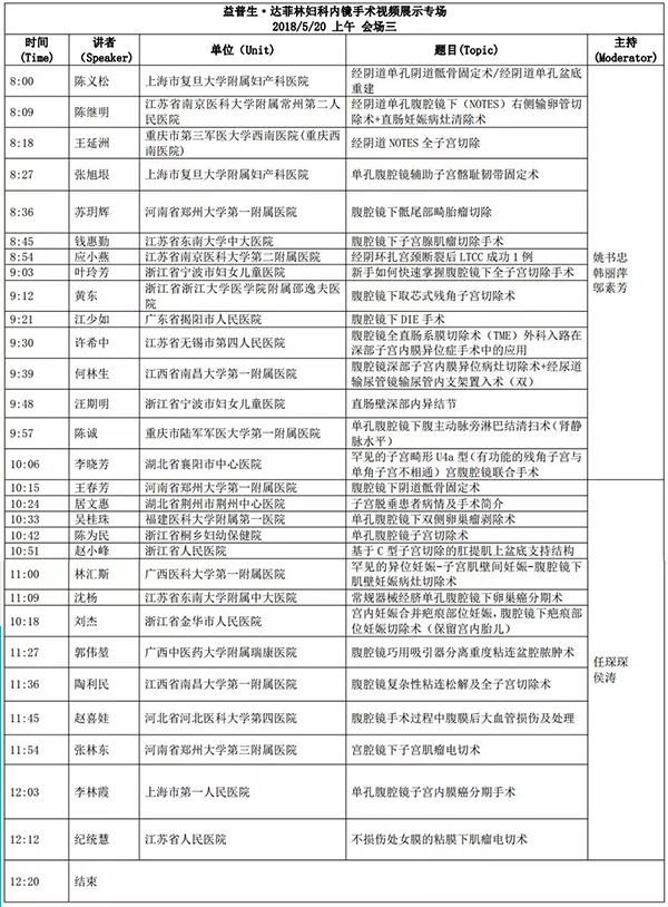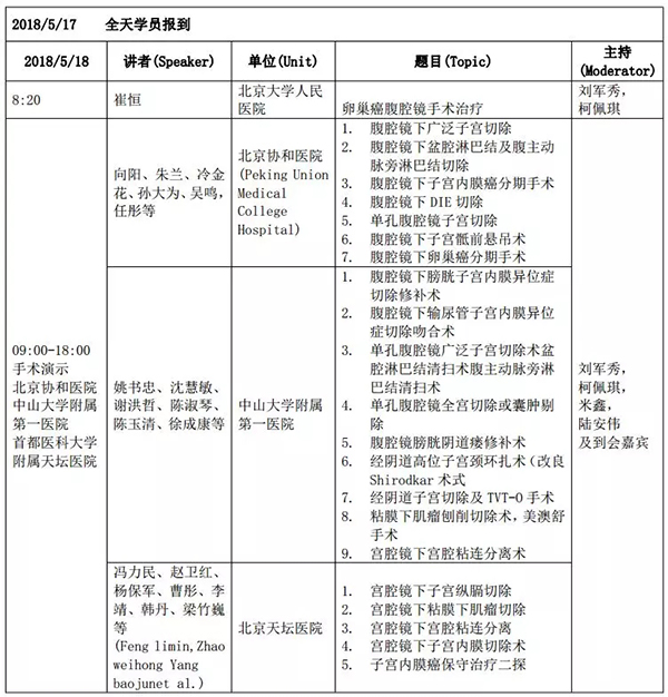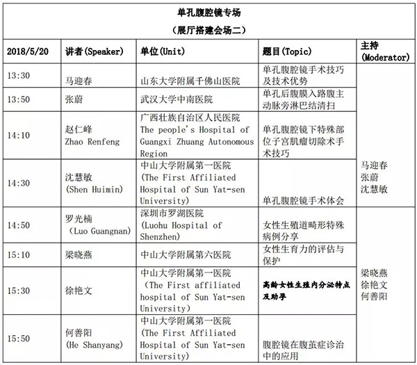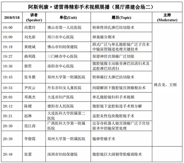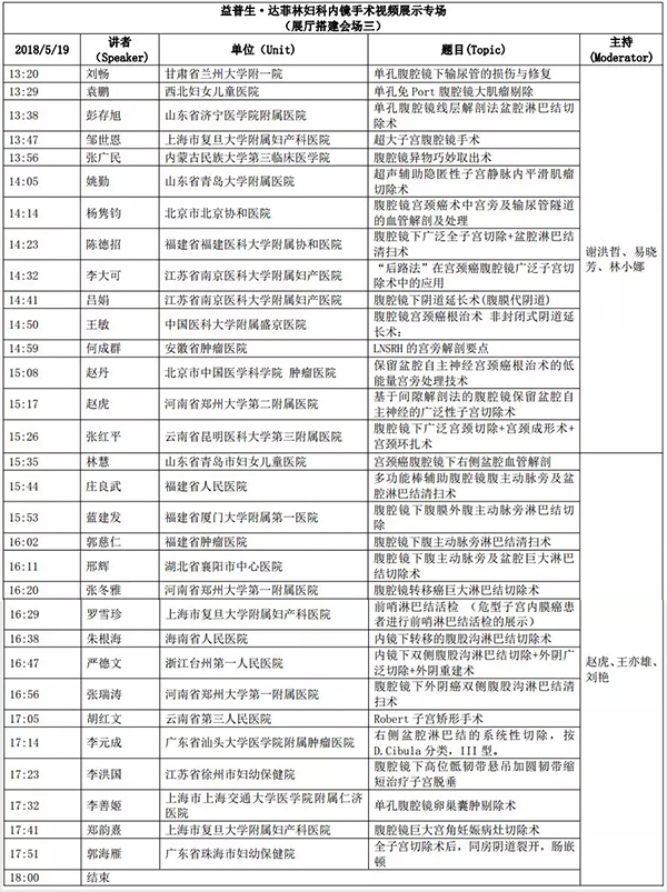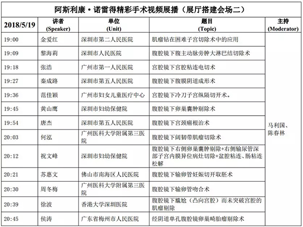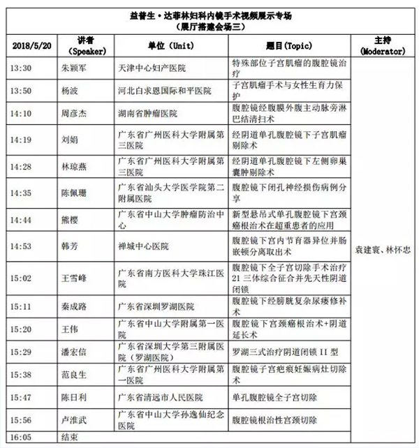 5月18日:全天腹腔鏡手術(shù)演示各類婦科腹腔鏡手術(shù)(手術(shù)視頻將由北京協(xié)和醫(yī)院、北京天壇醫(yī)院、中山大學(xué)附屬第一醫(yī)院同時(shí)手術(shù)轉(zhuǎn)至白云國際會(huì)議中心演示)