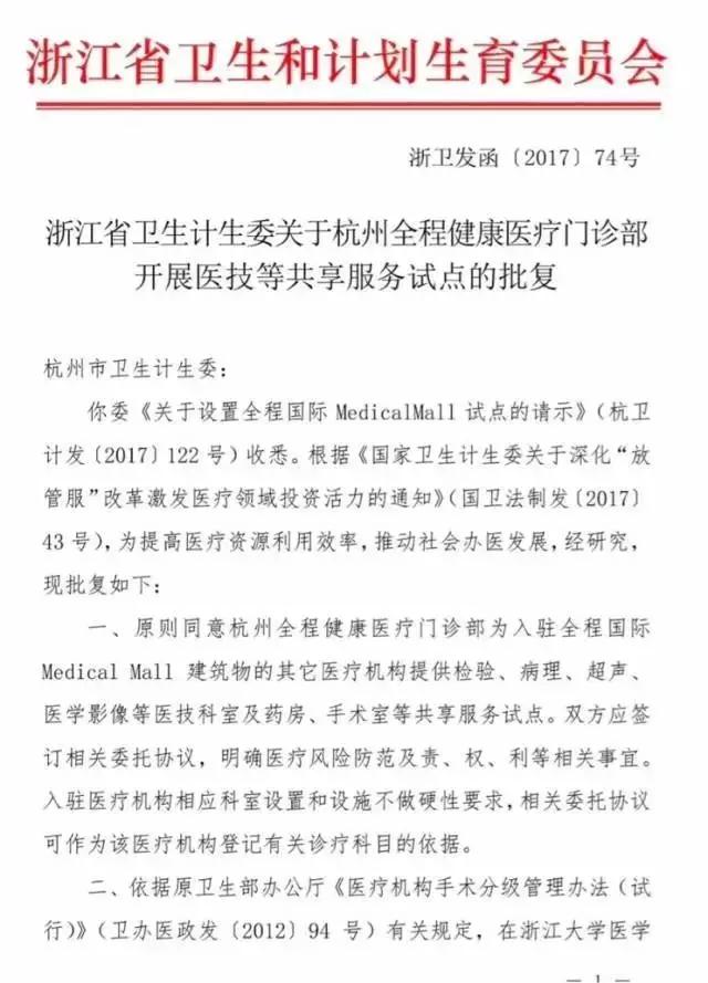 日前,浙江省衛計委批復同意:杭州全程健康醫療門診部為入駐全程國際 Medical Mall 的其他醫療機構提供檢驗、病理、超聲、醫學影像等醫技科室及藥房、手術室等共享服務試點。入駐醫療機構相應科室設置和設施不做硬性要求。