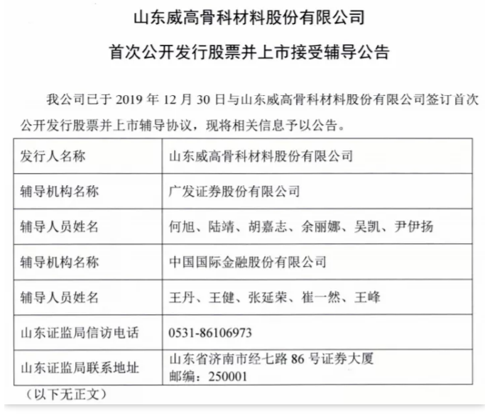 早在2019年12月30日,威高股份就發布公告稱,內幕消息建議分拆威高骨科,并于中國一間證券交易所上市。當日,威高骨科財務顧問就申請有關建議分拆上市之上市前輔導過程向中國證券監督管理委員會山東監管局提交申請。