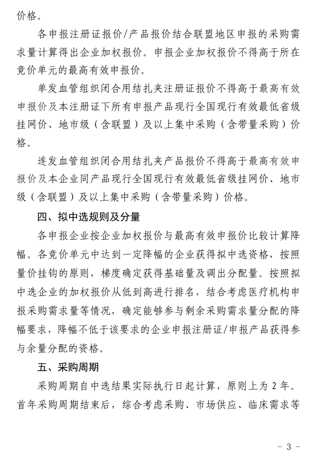 各競價單元中達到一定降幅的企業獲得擬中選資格,按照量價掛鉤的原則,梯度確定獲得基礎量及調出分配量。按照擬中選企業的加權報價從低到高進行排名,結合考慮醫療機構申報采購需求量等情況,確定能夠參與剩余采購需求量分配的降幅要求,降幅不低于該要求的企業申報注冊證/申報產品獲得參與余量分配的資格。