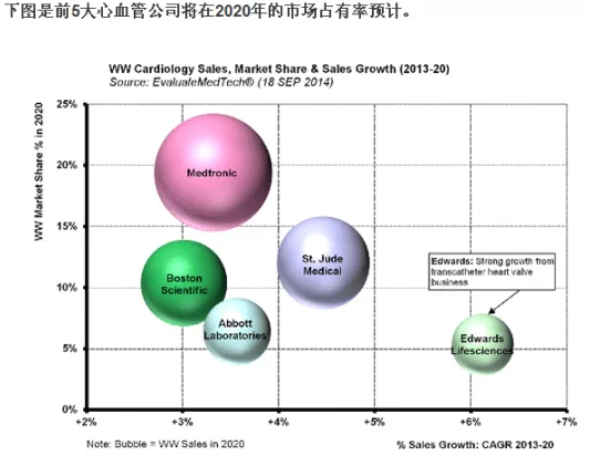 根據EvaluateMedTech的一份研究報告表明,美敦力將在未來6年,繼續引領心血管領域的市場。美敦力預計在2020年的全球銷售額將達到111億美金,將與第二大公司圣猶達醫療保持大幅的差距。而排在前五位的公司將會還有波士頓科學,雅培和愛德華。