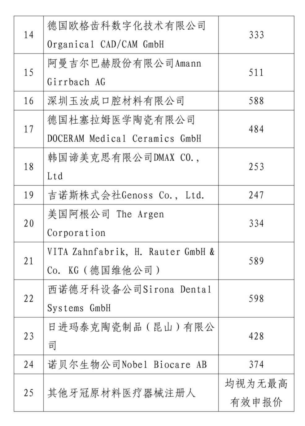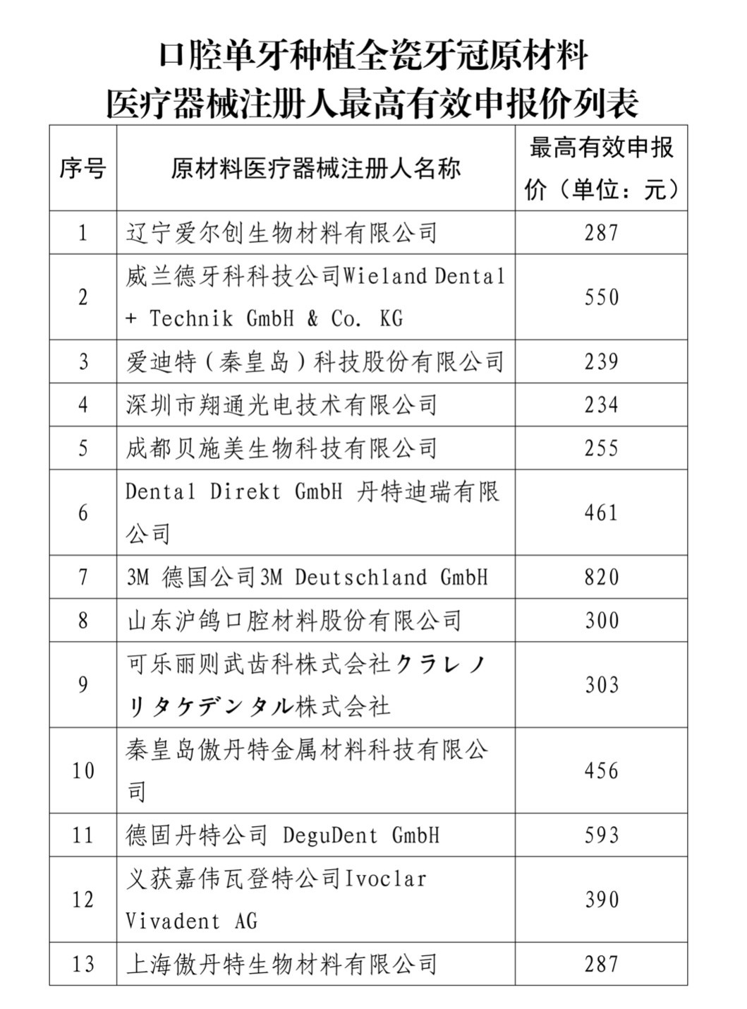 《通知》公布了各牙冠原材料醫(yī)療器械注冊人的最高有效申報價(見文末)。