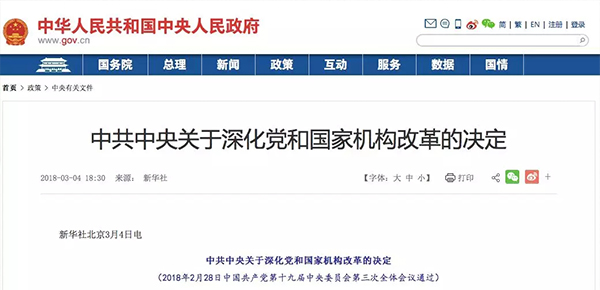 據(jù)新華社3月4日報道,中國共產(chǎn)黨第十九屆中央委員會第三次全體會議通過《中共中央關(guān)于深化黨和國家機構(gòu)改革的決定》(下稱《決定》),并正式對外公布。