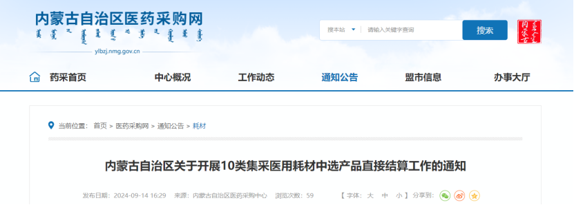 9月14日,內蒙古自治區醫藥采購中心發布《內蒙古自治區關于開展10類集采醫用耗材中選產品直接結算工作的通知》,其中明確,2024年10月1日起,對人工關節、脊柱類醫用耗材、骨水泥等10類集采中選產品開展直接結算工作。