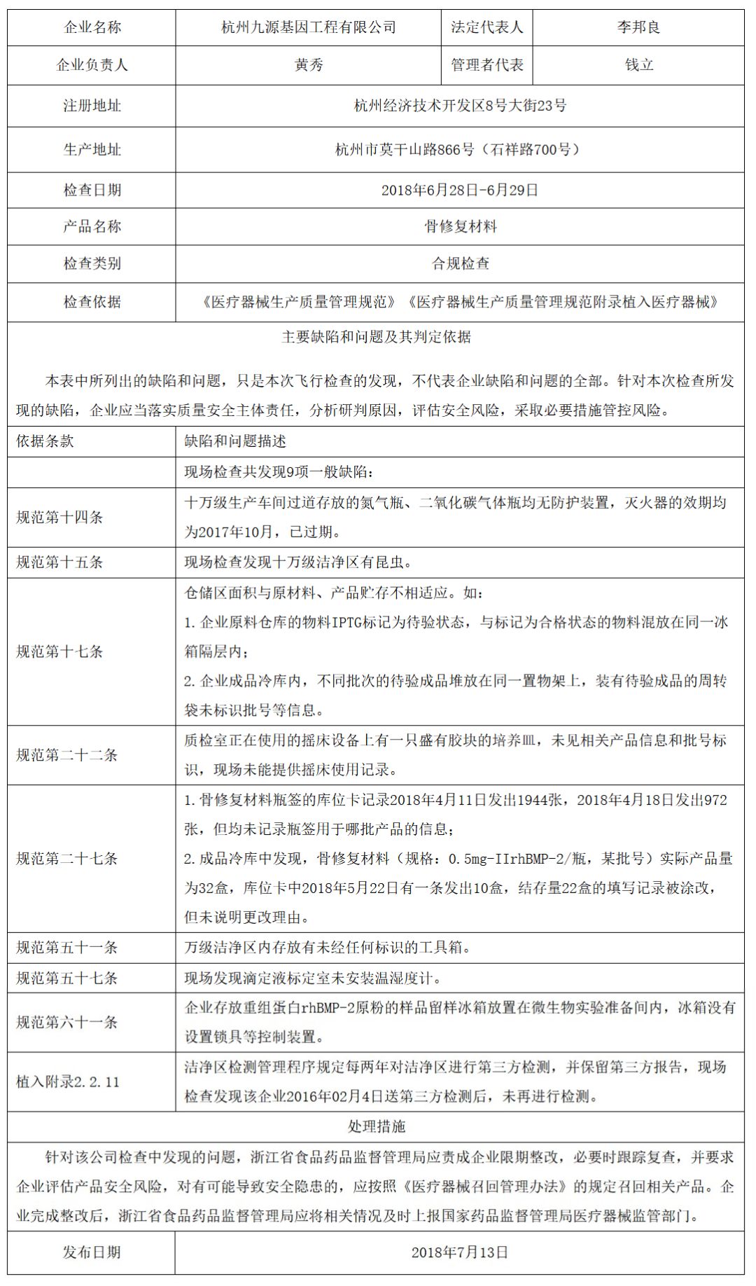 7月16日,國家藥品監督管理局官網發布了最新的醫療器械生產企業飛檢通報。通報顯示浙江、天津、河北、山西、山東、上海共8家醫療器械公司受到了總局的飛行檢查。其中1家公司確認處于停產狀態,7家公司發現一般缺陷,被要求限期整改。