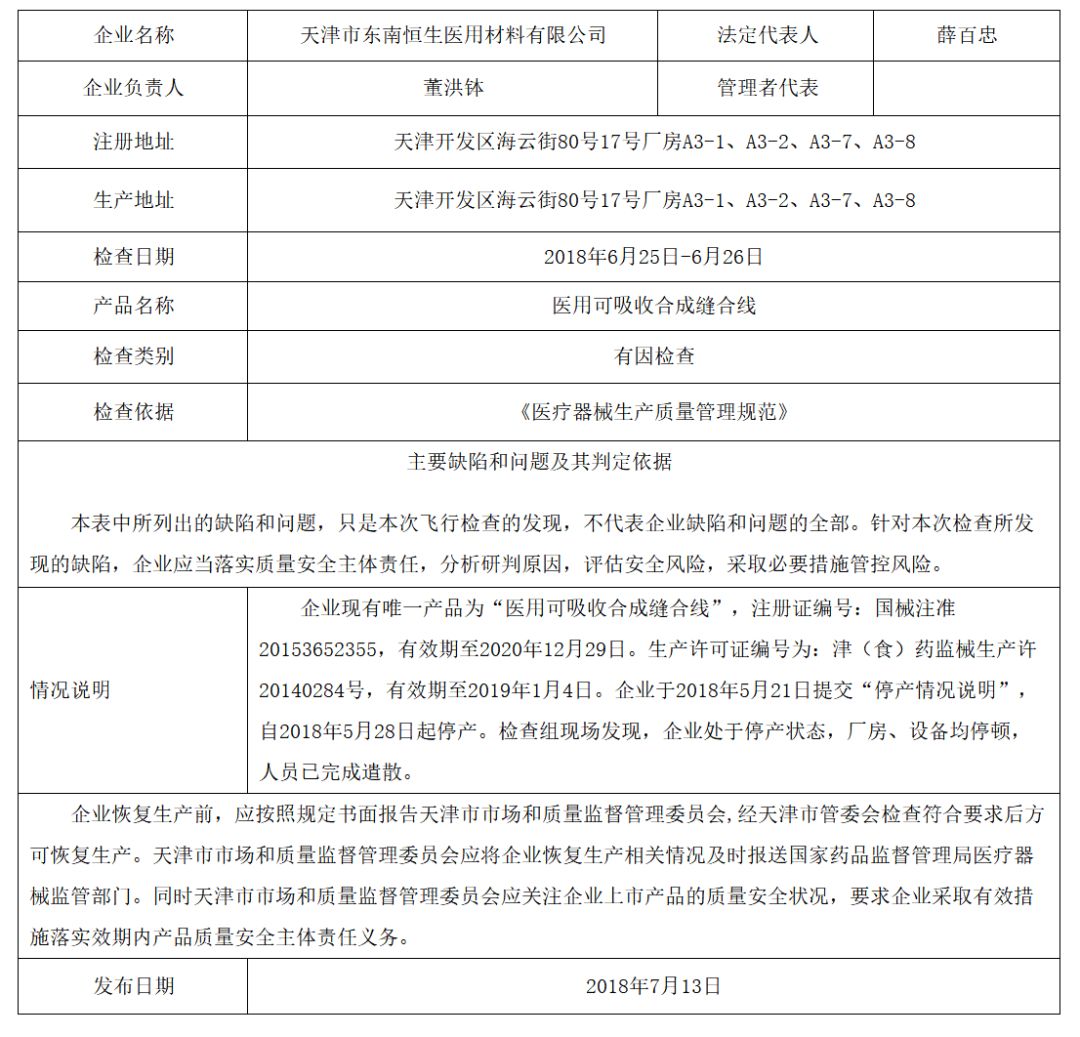 對天津市東南恒生醫用材料有限公司飛行檢查通報