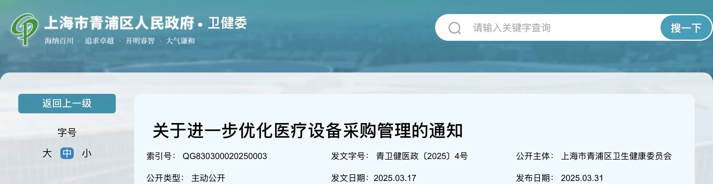 此外,在設備采購管理的政策上也有細化和調整,對相關采購管理提出更高要求。日前,上海市青浦區衛健委發布《關于進一步優化醫療設備采購管理的通知》(簡稱《通知》),覆蓋申報要求、時間規劃、采購形式、質控督查等諸多細則(完整見文末)。