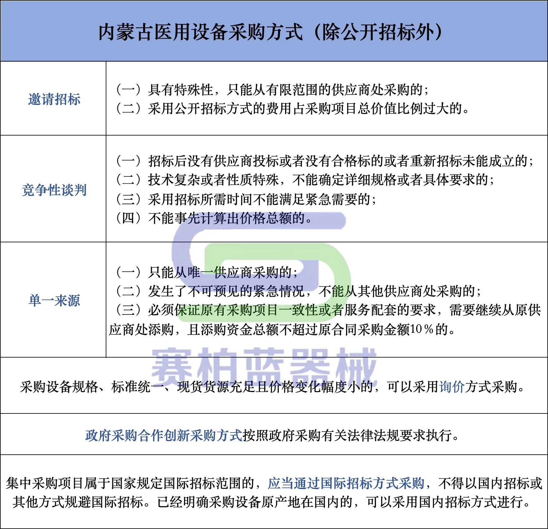 隨著設備采購經驗成熟,除公開招標外的采購方式也陸續建立。今年4月《內蒙古自治區醫用設備集中采購工作規范(試行)(征求意見稿)》出臺,其中就介紹了邀請招標、單一來源、競爭性談判、詢價等多種設備采購方式,具體如下: