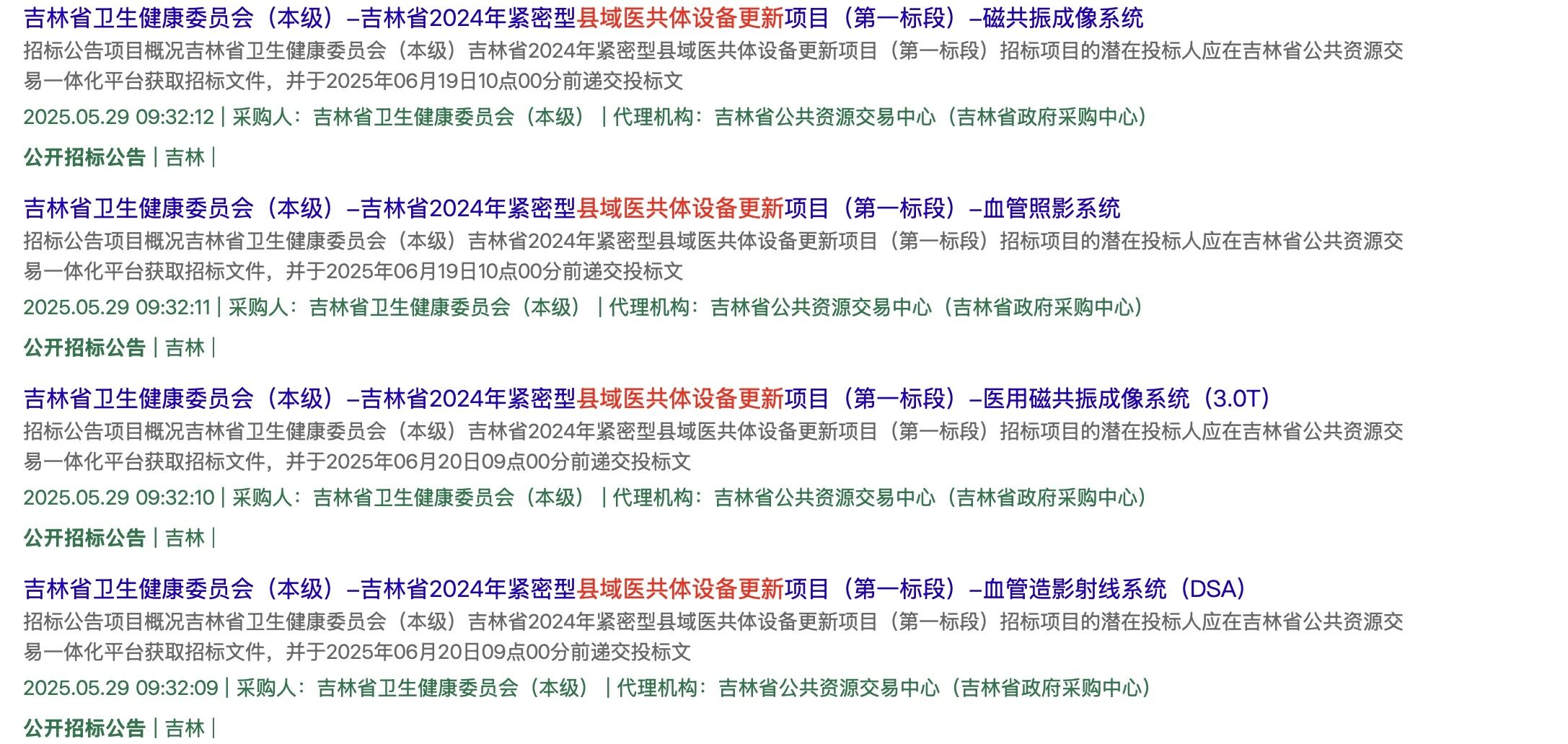 醫療設備采購在5月迎來爆發,其中縣域醫共體采購項目較為密集,安徽、黑龍江、遼寧、福建、新疆、山西等多地以發布招標公告,項目總預算已達十幾億元規模。今日(5月29日),吉林省2024年緊密型縣域醫共體設備更新項目正式啟動,覆蓋磁共振成像系統、血管照影系統、血管造影射線系統、醫用磁共振成像系統四大類別。