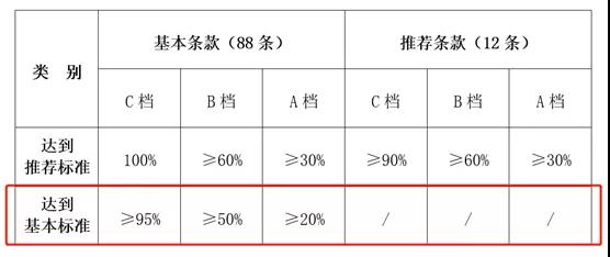 新版標(biāo)準(zhǔn)總共100條,分為88條基本條款和12條推薦條款,采用ABCD四個(gè)檔次進(jìn)行記分,A檔代表“優(yōu)秀”,B檔代表“良好”,C檔代表“合格”,D檔代表“不合格”。