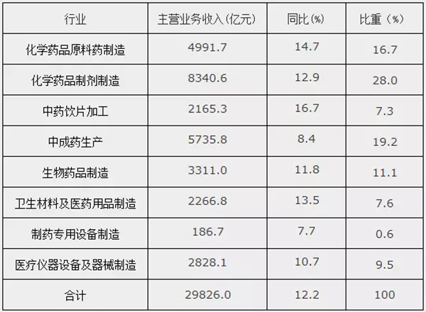 2017年,規(guī)模以上醫(yī)藥企業(yè)主營業(yè)務(wù)收入29826.0億元,同比增長12.2%,增速較2016年提高2.3個(gè)百分點(diǎn),恢復(fù)至兩位數(shù)增長。8個(gè)子行業(yè)主營業(yè)務(wù)收入增長情況如下表,其中增長最快的是中藥飲片加工業(yè)和化學(xué)藥品原料藥制造業(yè)。