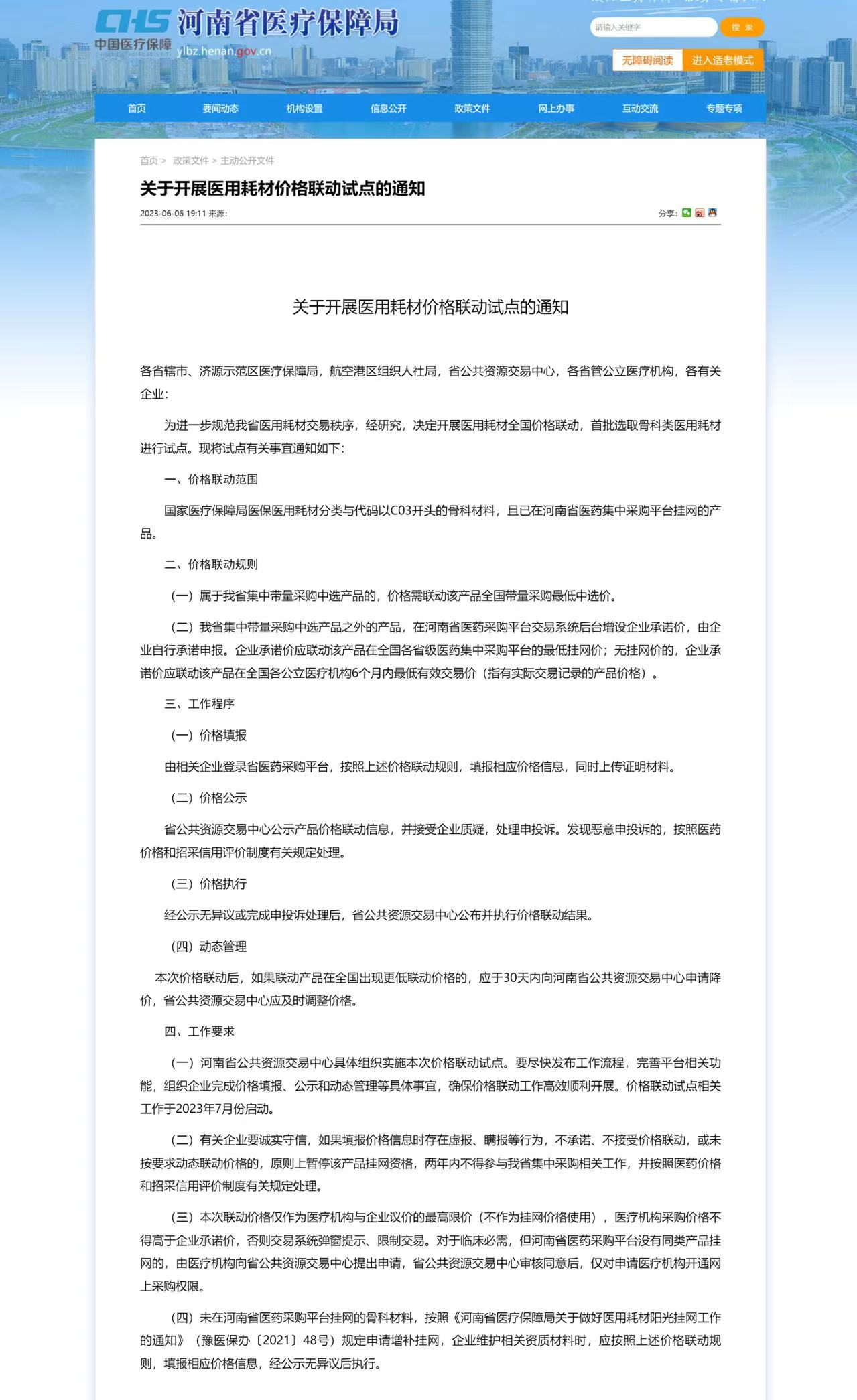 根據《通知》,此次價格聯動試點相關工作于2023年7月份啟動,價格聯動范圍包括國家醫療保障局醫保醫用耗材分類與代碼以C03開頭的骨科材料,且已在河南省醫藥集中采購平臺掛網的產品。