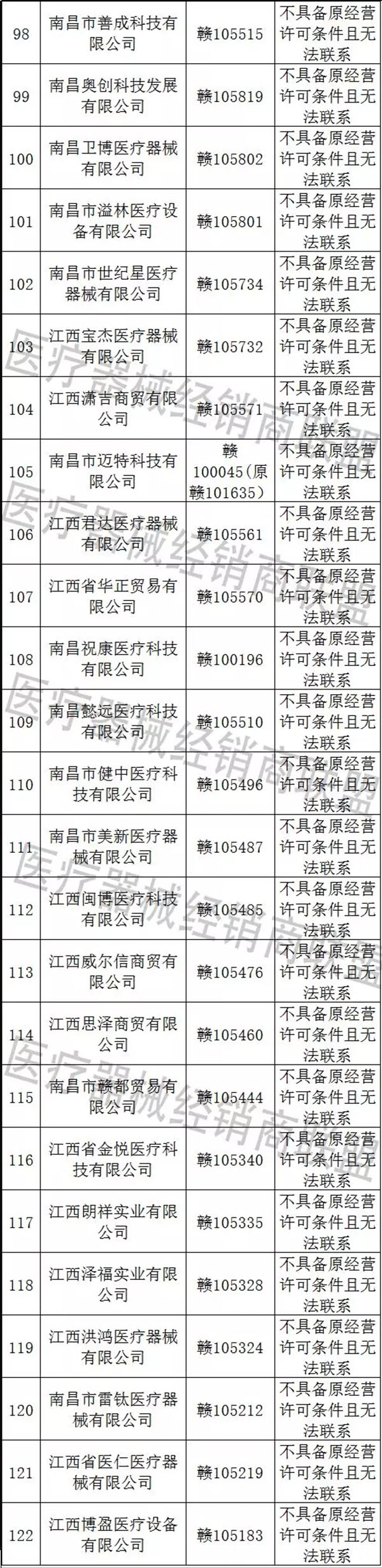 南昌市百康如貿易有限公司等87家企業不具備原經營許可條件且無法聯系。