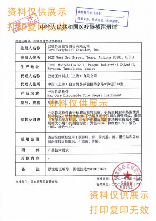 美國巴德MC1616一次性活檢針適用于確認癌癥組織病理與不確定之癌癥腫物,尺寸有12G-20G,以及不同長度。